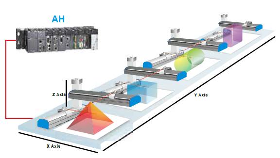 AH500的運動控制功能,可實現任意三軸直線插補、任意兩軸圓弧插補、及任意三軸螺旋插補與連續插補功能,透過臺達DMCNET高速通訊網絡架構,更可達到1ms的指令周期內12軸同動或4組3軸同動插補功能。無論是復雜的過程控制或是精密的運動控制需求,都能透過AH500來實現,有效應用于各種產業機臺,如建材機,經編機,食品包裝機等等。